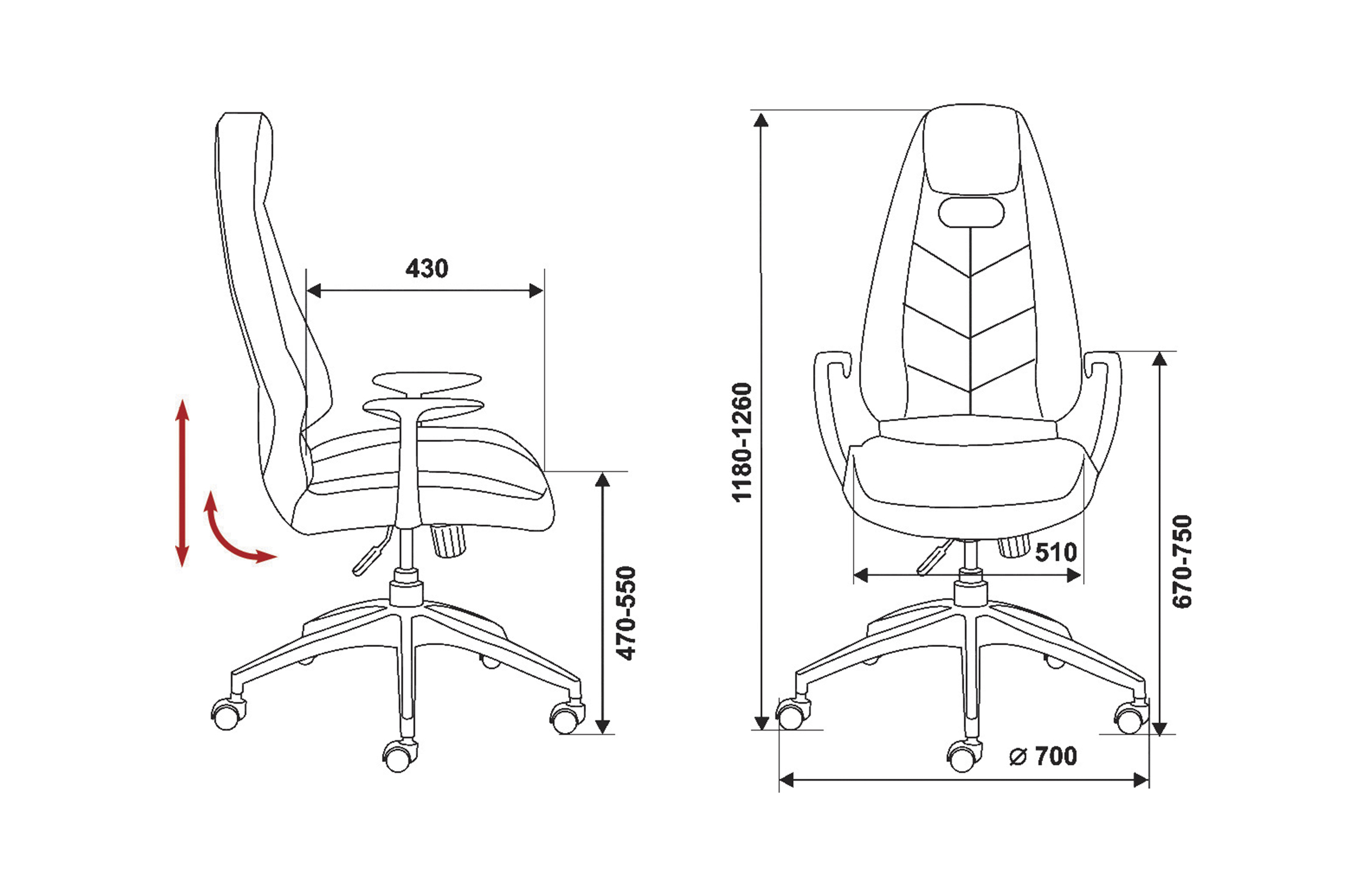 Диаметр колес - 6 см. Высота сиденья - 55 см. Высота с подлокотниками - 75 см. Ширина сиденья - 51 см. Глубина сиденья - 43 см. Материал колес - с накладкой PU. Синхромеханизм качания с регулировкой под вес и фиксацией в нескольких положениях. Подлокотники металлические (полированный алюминий) с мягкими кожаными накладками. Крестовина металлическая (полированный алюминий).